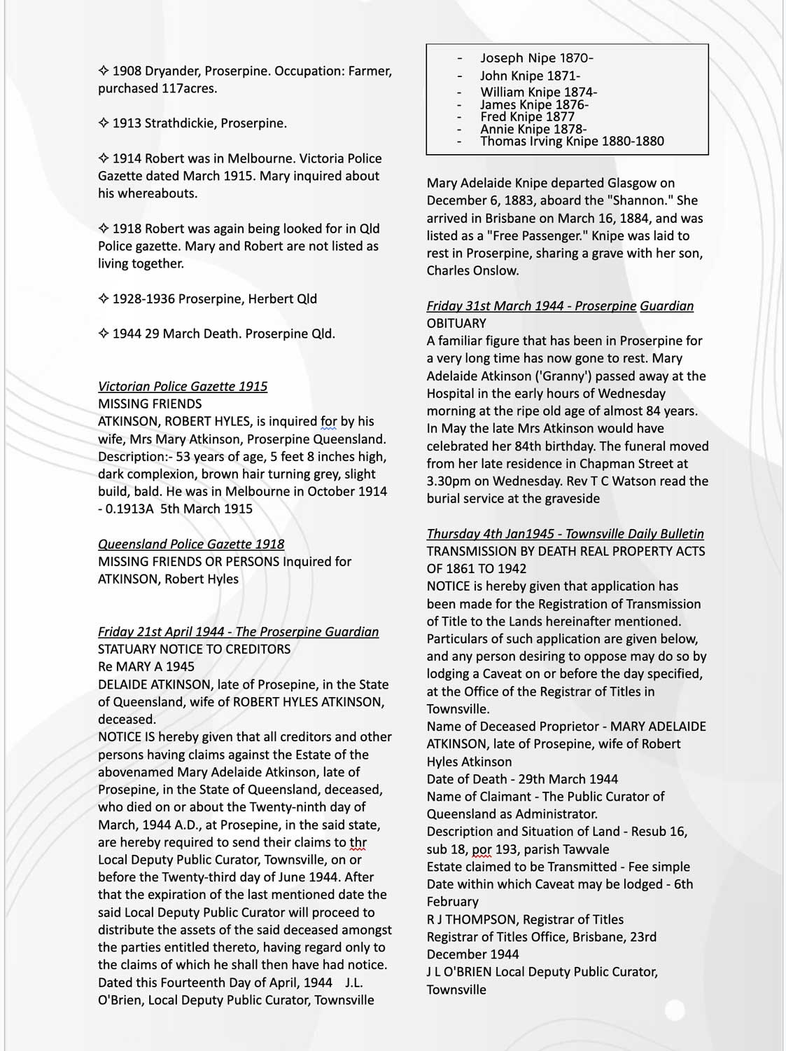 Robert Hyles Atkinson’s father was left some money in the Will of Lord Onslow. As Robert’s father had all ready committed suicide, it then went to him (being the oldest son). But Robert and his mother, Elizabeth had a falling out over the money. Robert referred it and so it went back into Chancery in England. Robert then moved to Queensland.