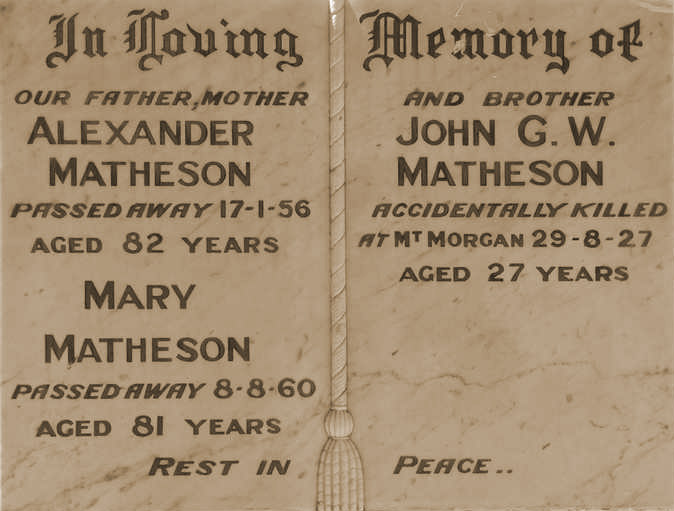 The late Mr. Matheson married Mary Clements, at Mt. Morgan on July 23, 1895. He is survived by his widow, seven daughters, Mesdames W. McLeod, G. Moulds, R. Jamieson, C. Ramsay, D. Jensen (M. Morgan), Mrs. A. Ceisiolka (Ravenshoe), Mrs. A. Jahnke (Calen) and three sons, Messrs. Alick (Banana station), Bill (Moura), George (Mt. Larcom) and one brother, William (Rockhampton). Two sons predeceased him.